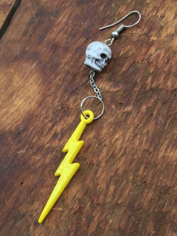 SHINY SKUNKS SINGLE EARRING, SKULL WITH LIGHTNING BOLT HANGING BY SILVER METAL CHAIN, HOOK STYLE, WHITE/YELLOW/SILVER