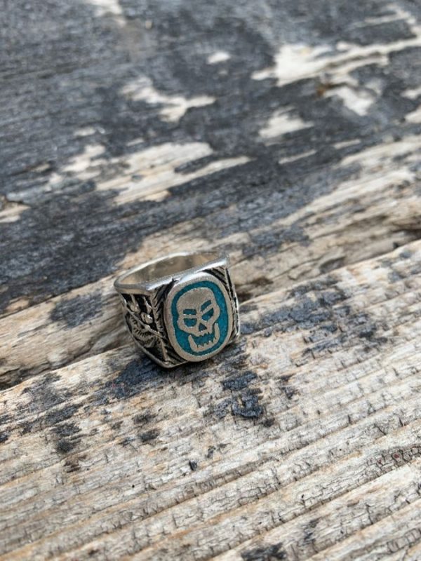 G&S RING, MOTORCYCLE BIKER STYLE, SKULL WITH INLAID CRUSHED TURQUOISE STONE, SILVER MOUNTING, SILVER/TURQUOISE, SIZE 8
