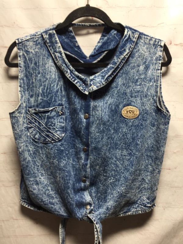 MJ Club denim top, sleeveless, button-up, tie bottom, faux collar in front, decorative v cut-out in back embellished with pearls, decorative right front chest pocket, logo patch front left chest, acid washed, medium-blue, size M
