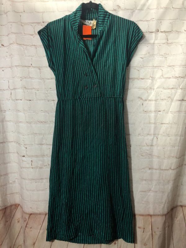 Tracy dress, midi length, sleeveless, button-up, stand-up collar, vertical striped pattern,