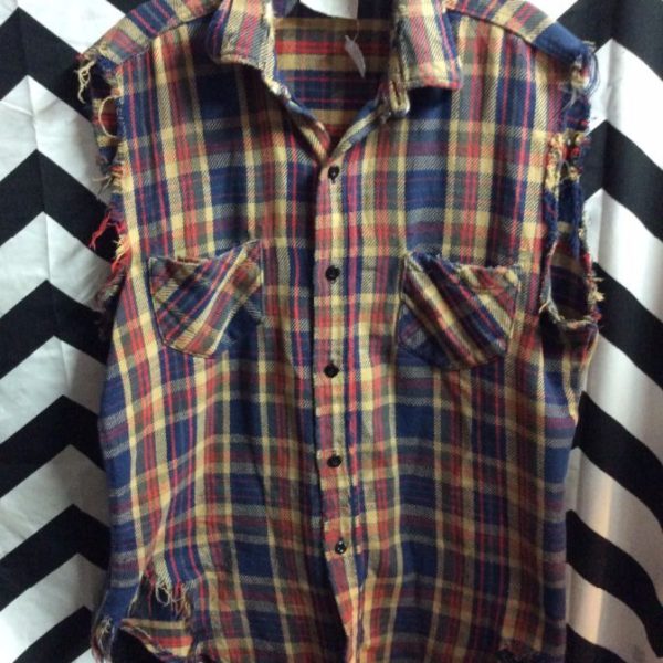 RETRO FLANNEL SHIRT – CUTOFF SLEEVES – FRAYED – FRONT POCKETS – CHECKED PRINT