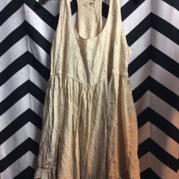 Dress, cotton, sleeveless, mini with racer back, small leaf pattern, ruffle on hem, creme, size one size fits all