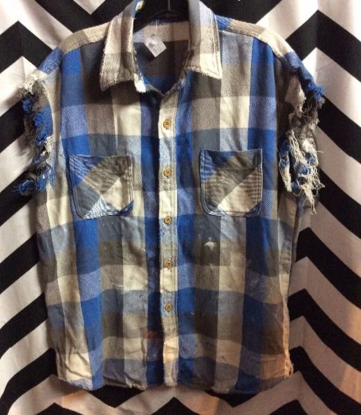 Flannel shirt, sleeveless, plaid design, paint splattered, frayed, distressed, blue/gray/white