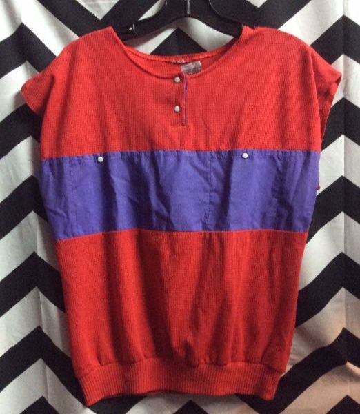 Top. sleeveless, mesh fabric, color block design, front pockets, red/purple