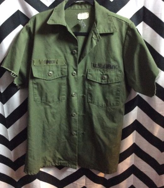 Military jacket, cutoff sleeves, button-up, dark olive green, size L