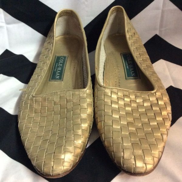 Shoes, leather, slip-on, woven, loafers, gold, size 6