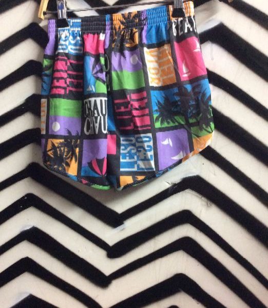 AMAZING DEADSTOCK 1980S DAYGLO NEON BEACH PRINT SHORTS WITH STRETCH WAIST