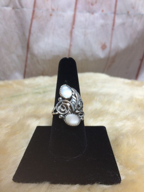 TWO MOTHER OF PEARL STONES RING W/ FEATHER & SWIRL DESIGN STERLING SILVER 925