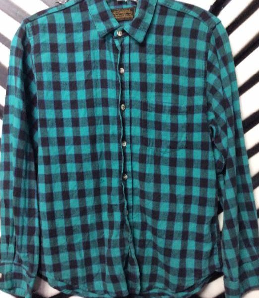 Flannel shirt, long sleeve button-up, checkered design, teal/black, size S small fit