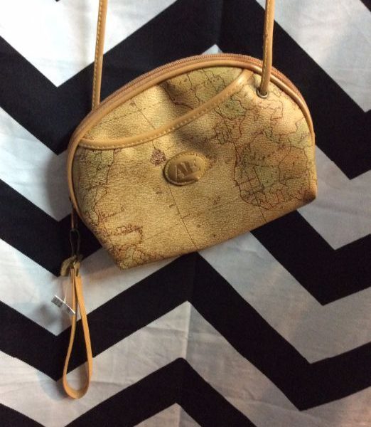 Leather purse, small, half circle style, map print design, hand strap or long shoulder strap option, tan