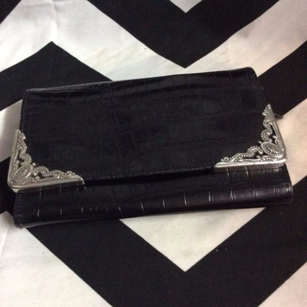 HAND PURSE, CLUTCH STYLE, LEATHER WITH EMBOSSED SNAKE SKIN DESIGN, ORGANIZER INSIDE, SILVER METAL CORNER TRIM, BLACK/SILVER, SIZE 5″ X 7.5″