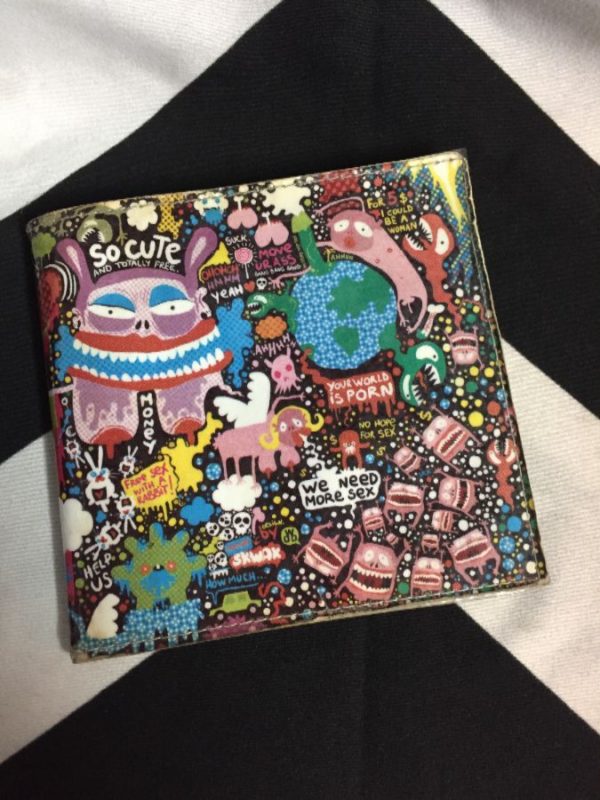 Poketo wallet, vinyl, So Cute/Your World Is Porn/Sex Sells/We Need More Sex etc. signs in crazy graphic design, multi
