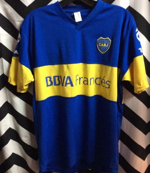 Soccer jersey, short sleeves, CABL, BBVA Frances, single horizontal stripe design shirt & sleeves, blue/yellow/white