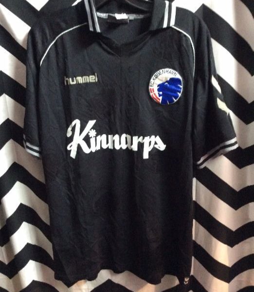 Soccer jersey, FC Kobenhavn (Copenhagen), Kinnarps, striped trim on neck & sleeves, screen printed full front & back, black/white, size XL