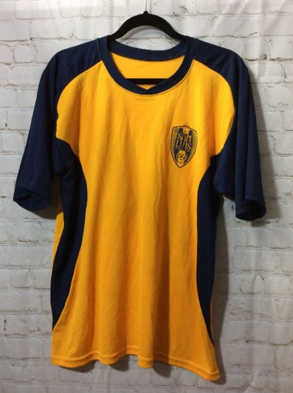 NIKE SOCCER JERSEY, PULLOVER, COLOR-BLOCK DESIGN, SAN LUIS FUTBOL CLUB #12, LEFT FRONT LOGO, YELLOW/NAVY