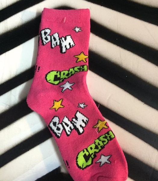Socks- pink/white/green with Crash, Bam, Pow lettering design