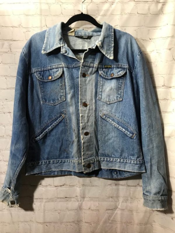 1970’s classic Wrangler denim jacket, button-up, 4 front pockets, soft, acid washed, distressed, blue, size 46 as is