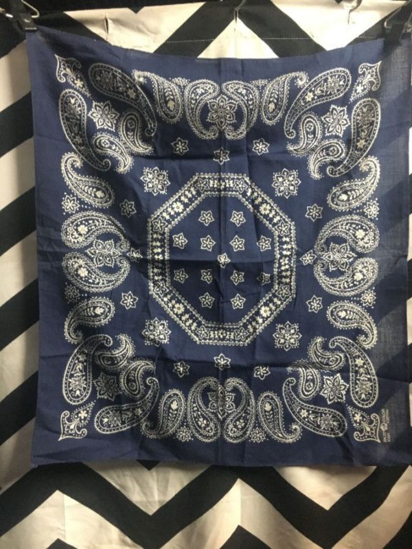 Bandana, soft, cotton, octagon center shape surrounded by Paisley floral print design, navy/white