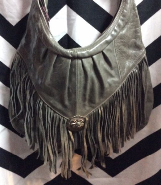 Hobo bag, leather, with fringe & conchos, soft, gray