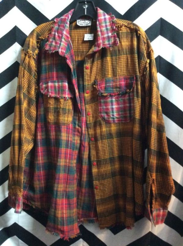 Flannel shirt, long sleeve, button-up, soft, split plaid design patchwork, frayed edge design, red/yellow/green, size L