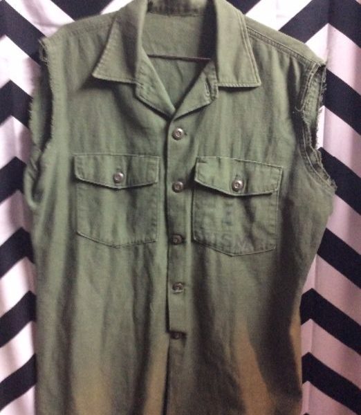 Military vest, cutout sleeves, button-up, soft, stamped USMC, olive green