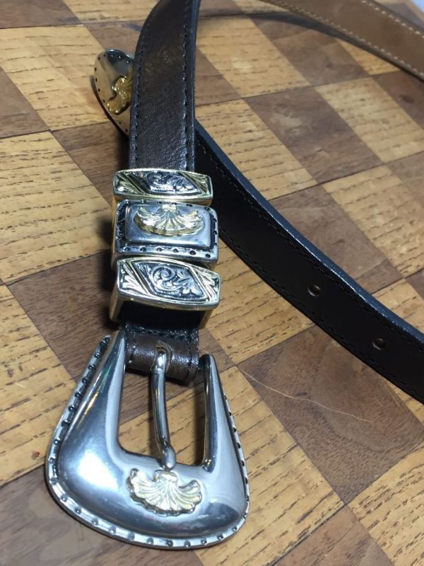 Streets Ahead belt, soft, skinny, ornate heavy silver metal buckle & triple belt loops, chocolate brown/silver, size S