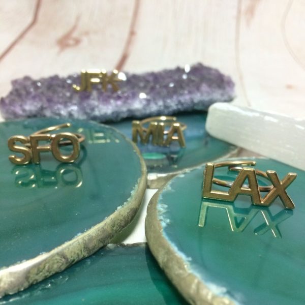 AIRPORT CODE RING SOLID BRASS WRAP AROUND ADJUSTABLE SHANK LAX SFO MIA