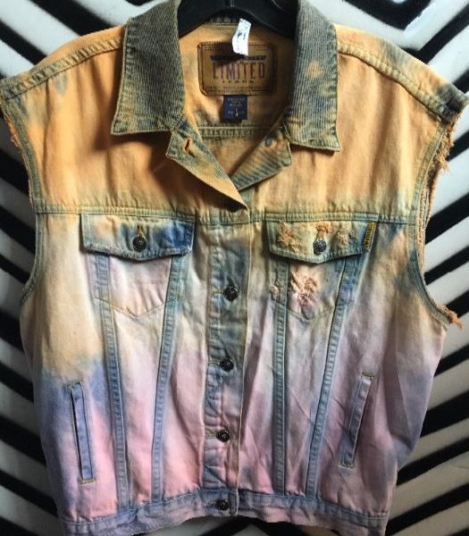 Denim vest, cut off sleeves, sorbet colored design, orange/pink rips on back
