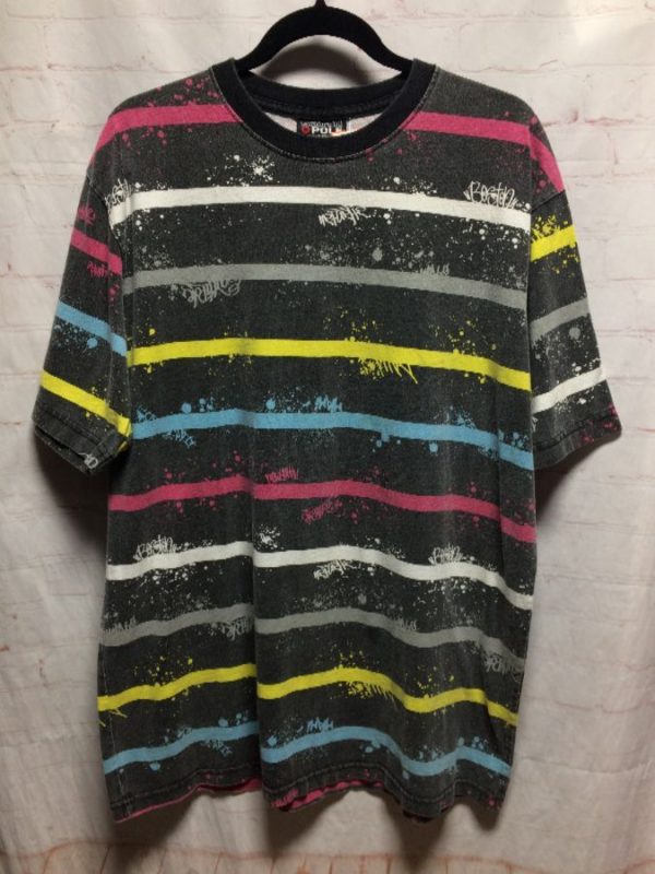 SOUTH POLE COLORFUL HORIZONTAL STRIPES T-SHIRT W/ CITY NAMES IN GRAFFITI
