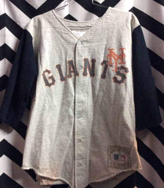 Baseball style jersey, NY Giants, long sleeve, button-up, contrasting sleeves, gray/black, size M