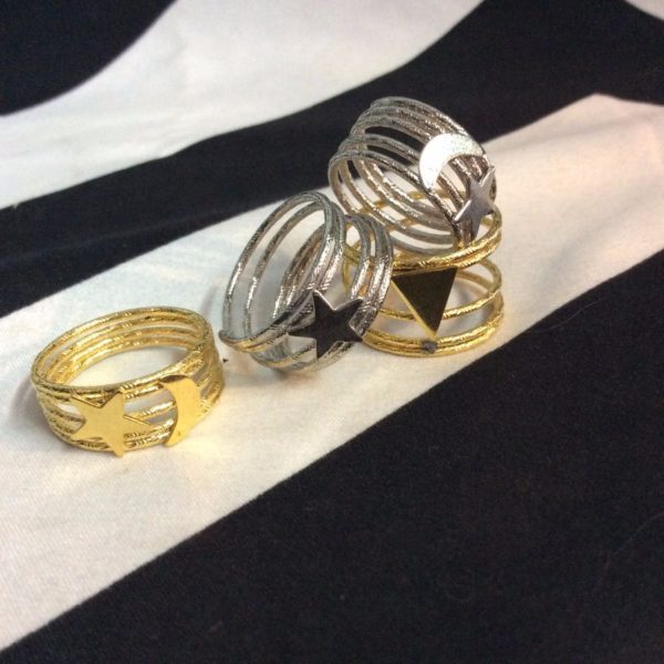 Ring, spring w/charms, star/moon/diamond, silver/gold, size adjustable