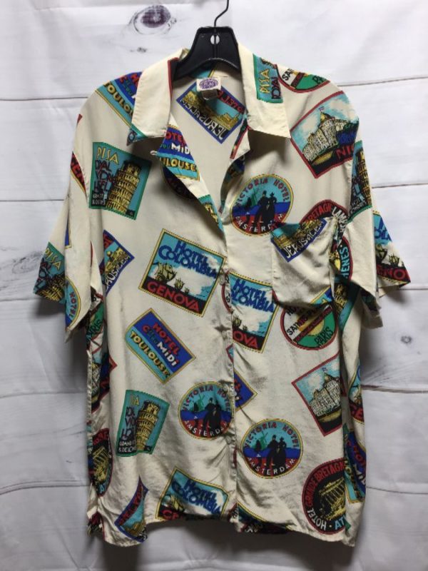 Saks 5th Ave. shirt, silk, short sleeves, button-up, International hotel designs in a patchwork style print, off white/red/blue/green/black/yellow, size L As is
