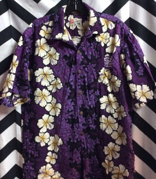 1960’s Hawaiian shirt, short sleeve, button-up, floral print, purple/creme, size L