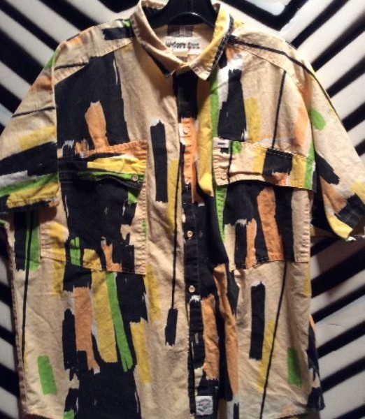 Vintage 1980’s “Whooos-Shirt” short sleeve shirt, button up, pastel print in sorbet, size L