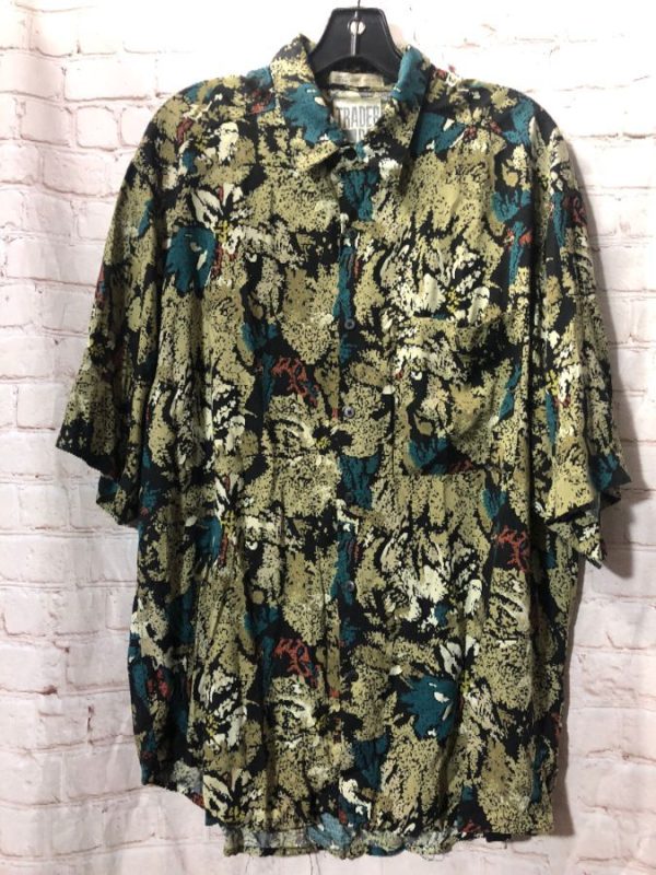 1990’s Trader Bay Hawaiian shirt, short sleeves, button-up, funky print in earth tones, taupe/black/teal/brown, size L