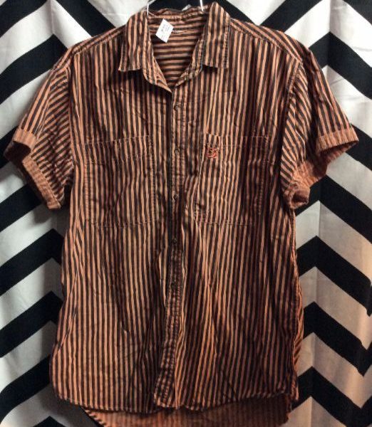 1990’s Saved By The Bell shirt, short sleeves, button-up, vertical stripe print, rust/black, size L