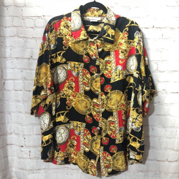 Victoria Jones shirt, short sleeves, button-up, Baroque print with lions & watches, amazing, gold/black/white/red, size 3X