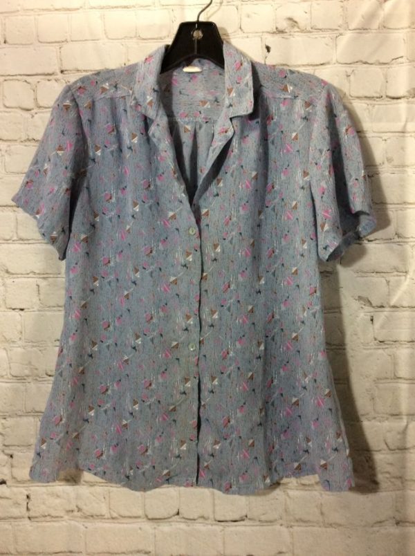Blouse, short sleeves, button-up, geometric pattern, blue/pink/red/white, size S