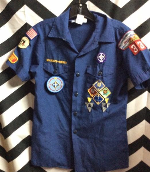 Boy Scouts shirt, short sleeve, button-up, front pockets, covered with merit badges & patches, navy, S/M