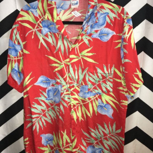 Classic Hawaiian shirt, rayon, short sleeve, button-up, floral print design, red/blue/green, size M