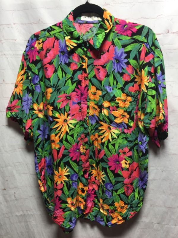 Anchor Blue shirt, short sleeves, button-up, collar, floral print in bright colors, green/pink/black/blue/yellow, size M