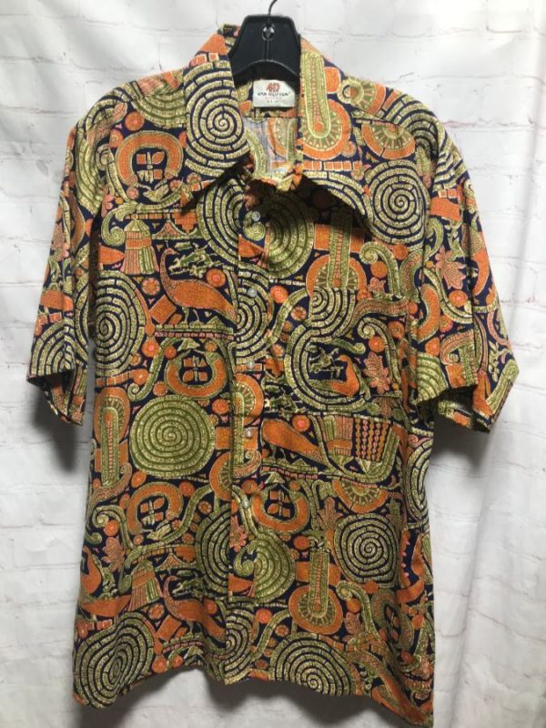 417 Van Heusen shirt, cotton, short sleeves, button-up, colorful Aztec design print, green/navy blue/orange/pink, size L