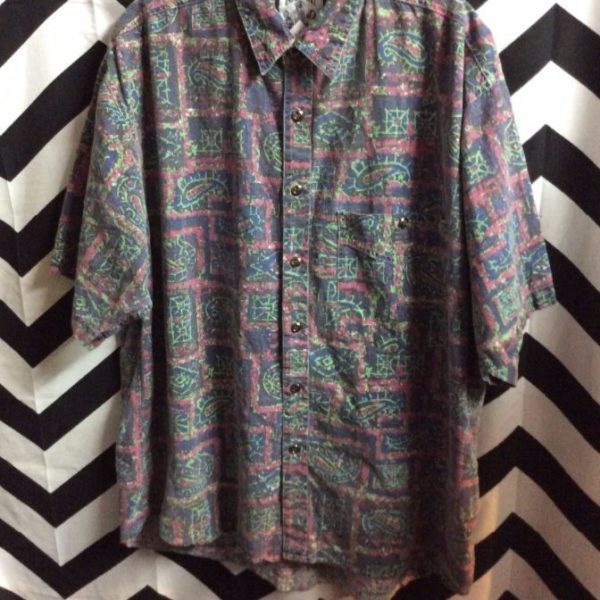 1990’s shirt, cotton, short sleeves, button-up, Zack Morris, Saved By The Bell Print, purple/green