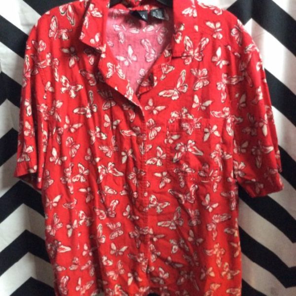 Shirt, cotton, short sleeves, button-up, Butterfly design print, red/white, size XL