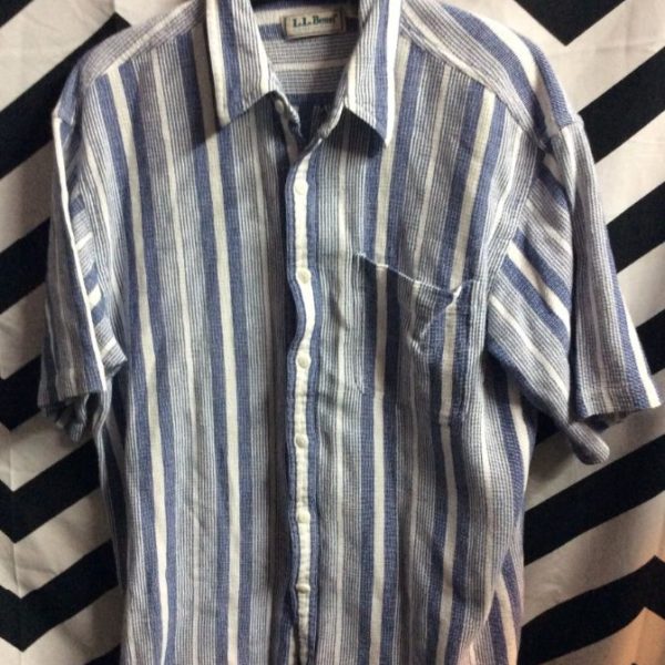 L.L. Bean shirt, short sleeves, button-up, cotton, ethnic vertical stripe design, white/blue