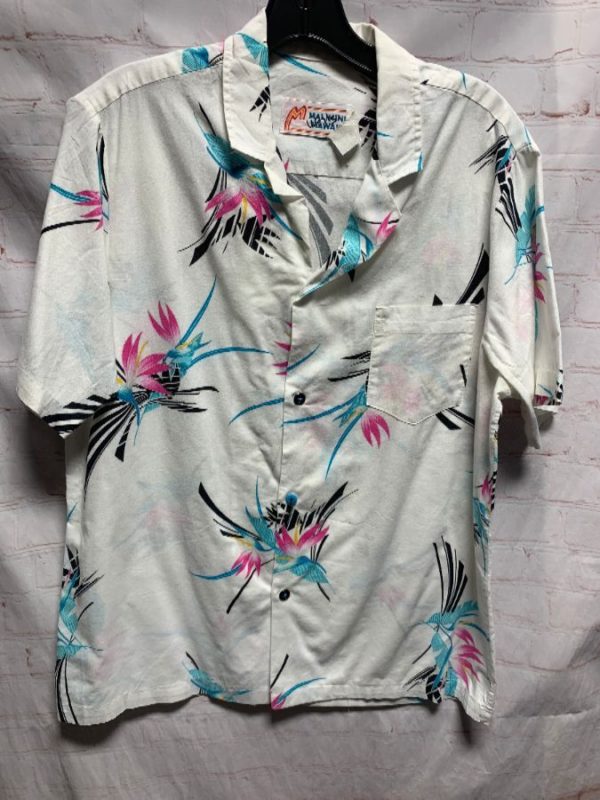 Malihini Hawaii – Hawaiian shirt, cotton, short sleeves, button-up, rad Birds of Paradise floral print, left front pocket, white/black/blue/ipink, size M