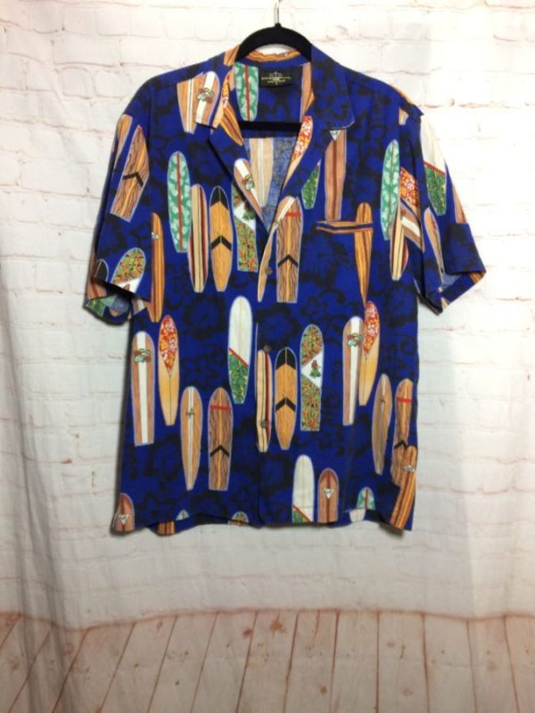 Royal Creations Hawaiian shirt, cotton, short sleeves, button-up, long-board print design, blue/black/brown/green/white, size L