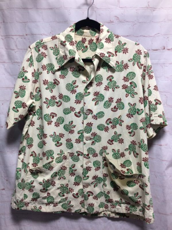 COTTON HAWAIIAN SHIRT W/ PINEAPPLE & SOMBRERO ALLOVER PRINT