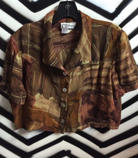 Hawaiian shirt, cropped, rayon, short sleeves button-up, tan/brown ethnic print, size S
