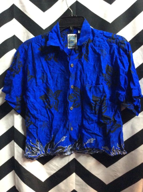 Hawaiian shirt, cropped, rayon, short sleeve, button-up, tropical floral pattern, indigo blue/black, size M